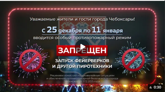 На территории Чебоксар введён противопожарный режим, который запрещает запуск фейерверков. Это ради безопасности наших родных и близких, животных и экологии. Пусть эти праздничные дни станут традицией осознанности — где главное чудо не в небе, а вокруг: в глазах близких, в хрусте снега, в ощущении безопасности. |