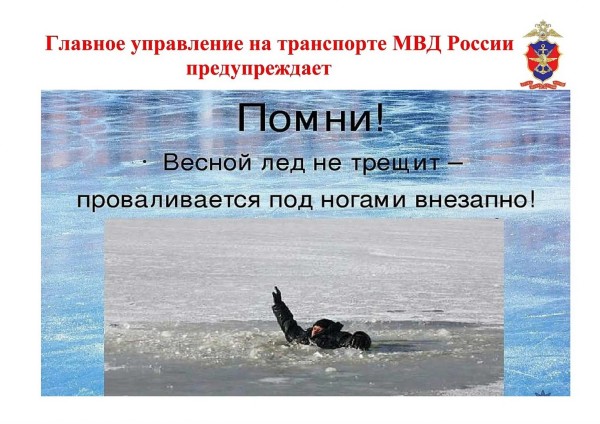 В целях предупреждения несчастных случаев с несовершеннолетними в период тонкого льда и ледохода Главное управлением на транспорте МВД России напоминает о необходимости соблюдения правил безопасности на водоёмах. Уважаемые родители! Ежедневно говорите детям о важности соблюдения правил безопасности. Этим Вы поможете своим детям избежать опасных ситуаций.