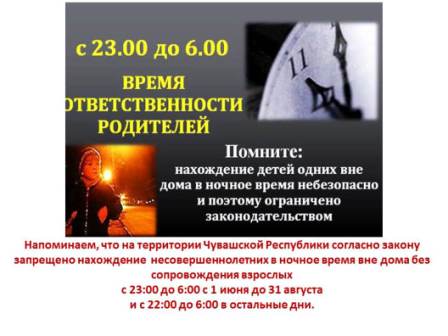 Уважаемые, родители. Напоминаем, что на территории Чувашской Республики согласно закону запрещено нахождение несовершеннолетних в ночное время без сопровождения взрослых с 23:00 до 6:00 с 1 июня до 31 августа и с 22:00 до 6:00 в остальное время.